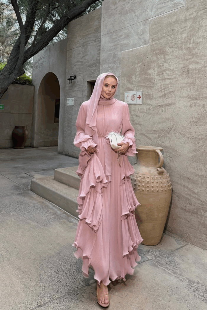 Elbisenin zarif tasarımı,Piliseli yapısı sayesinde hareket özgürlüğü sağlarken, seyyar kuşağı belinizi vurgulayıp size feminen bir hava katıyor. Arkadaki fermuar detayı ise elbisenin giyimini kolaylaştırıyor.